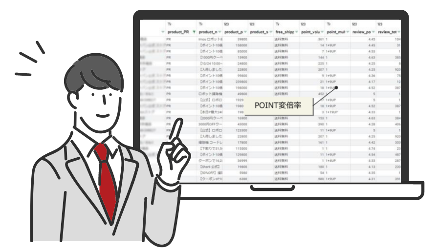 弊社では自社開発RPAシステムにより、楽天市場へ出店している店舗の売上や商品データなどを収集し、データ化しています。